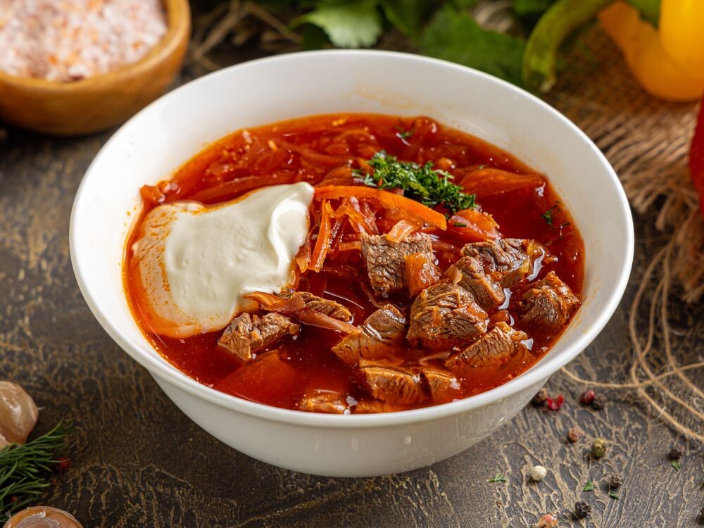 Говядина, капуста, свёкла, морковь, перец красный, перец зелёный, картошка, лук репчатый